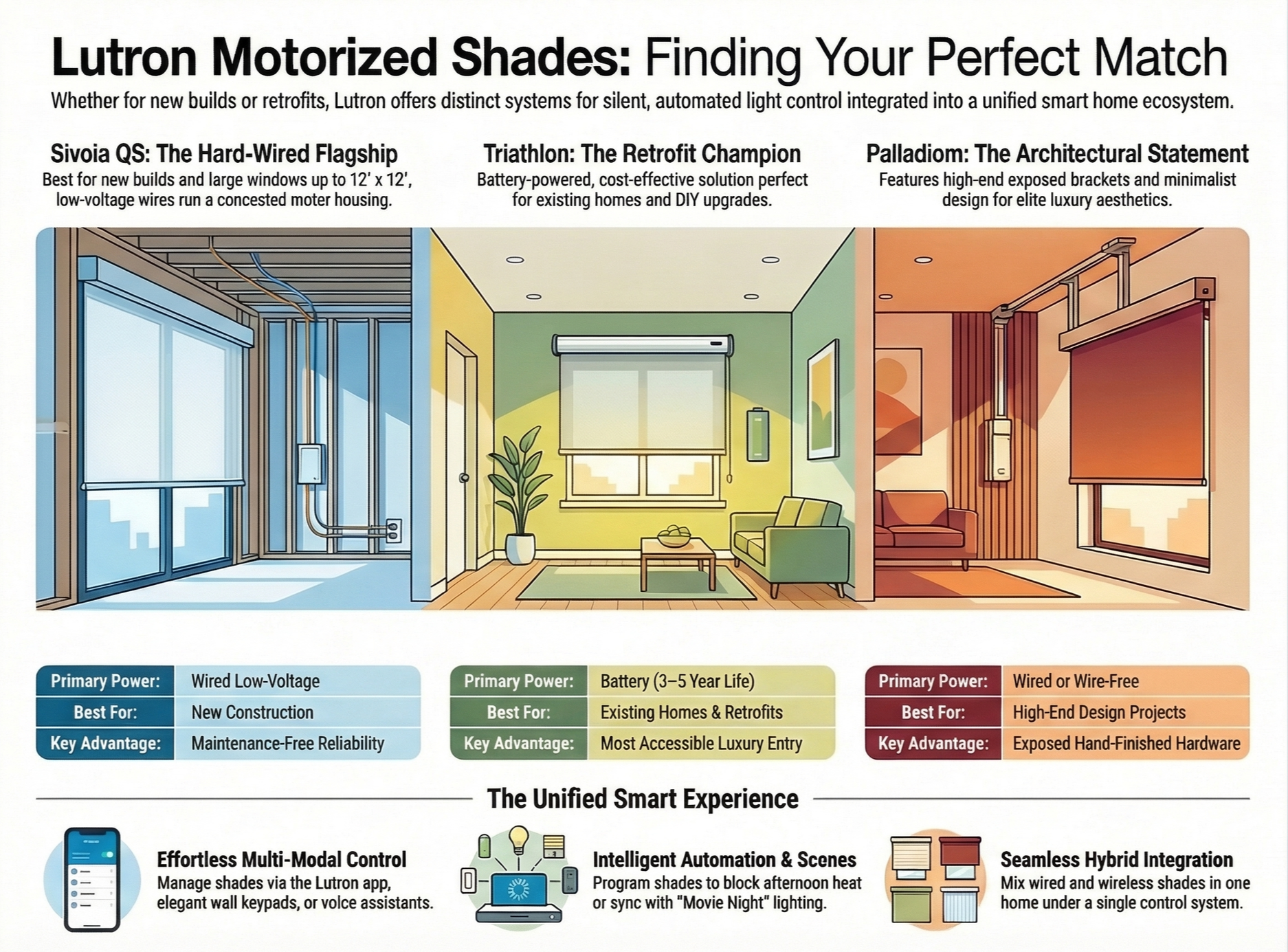 A detailed comparison guide highlights three types of Lutron motorized shading systems designed for different applications. The visual is divided into three sections: Sivoia QS for new construction with hard-wired, low-voltage power; Triathlon for retrofits with battery-powered convenience; and Palladiom for high-end architectural designs with exposed, minimalist hardware. Each section includes illustrated room scenes and key specifications such as power source, ideal use case, and primary advantage.