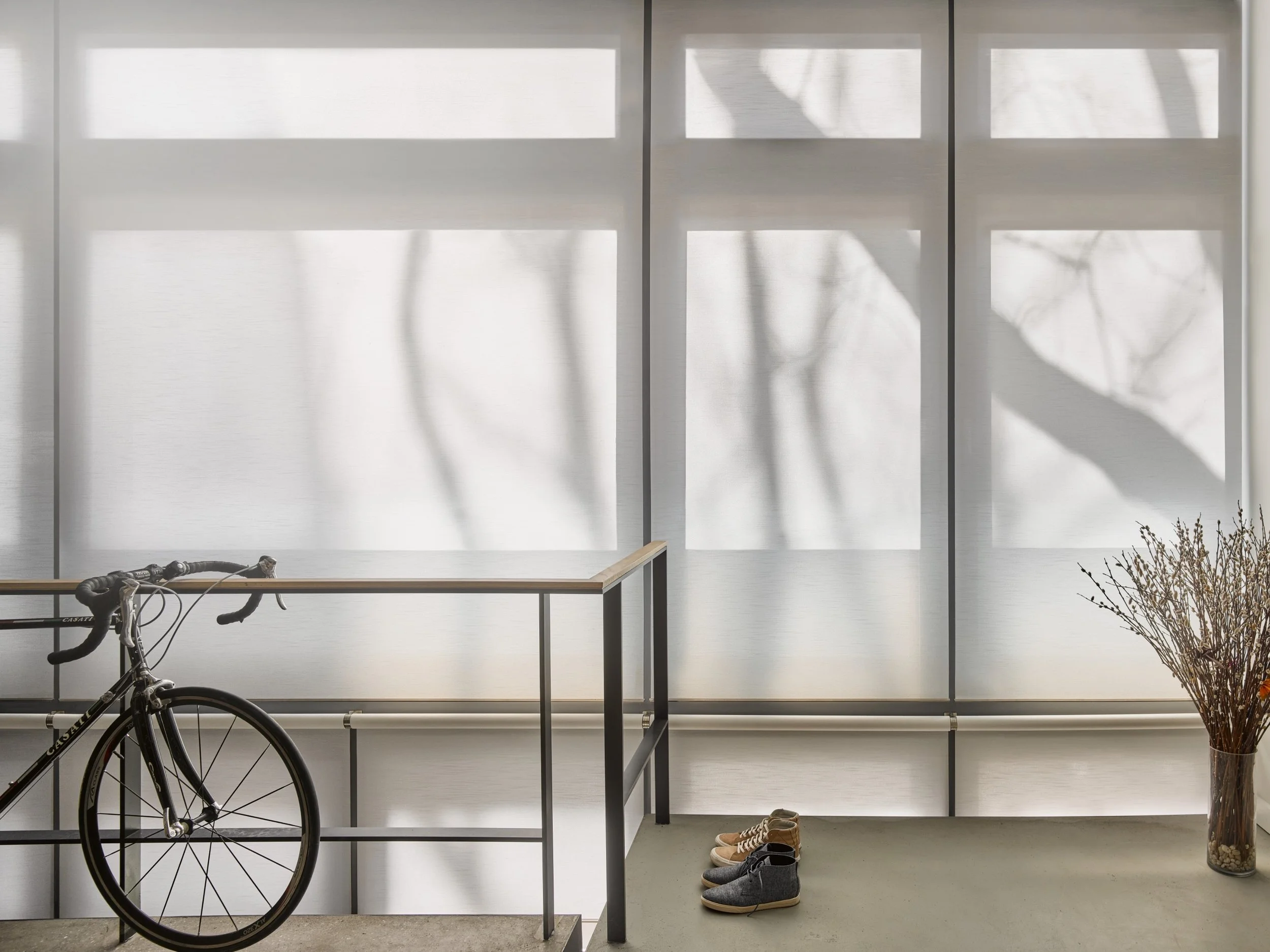 A room with large frosted windows casting shadows of tree branches. A bicycle leans against a railing on the left. On the floor to the right, there are two pairs of shoes and a tall vase with dried branches.