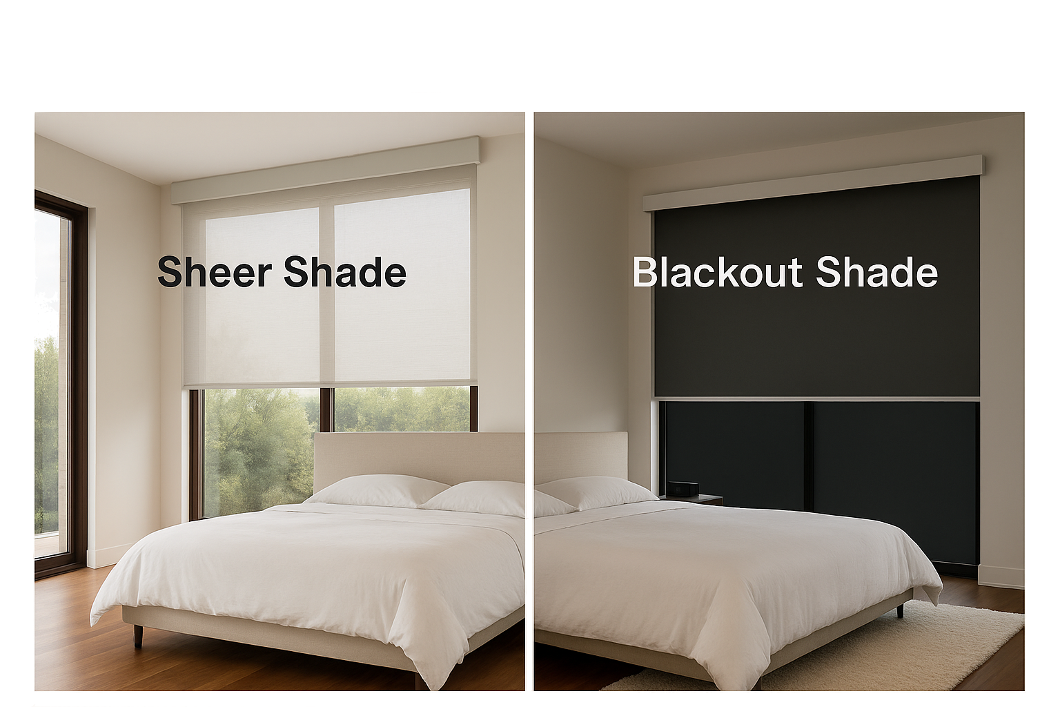Comparison of a bedroom with sheers and blackout shades. The left shows a bedroom with sheers letting in light, the right has black blackout shades drawn.