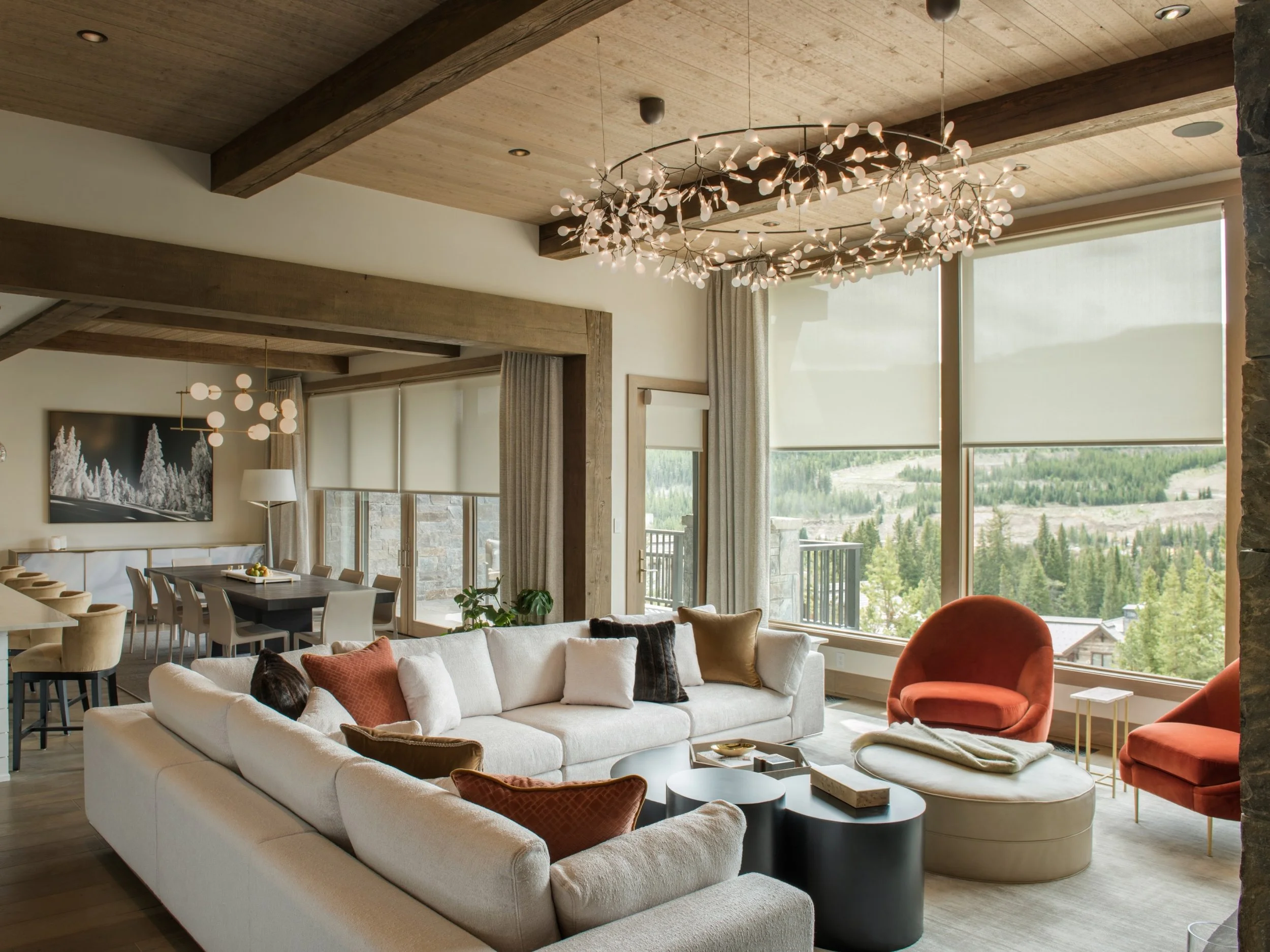 Living room with large windows overlooking forested landscape, white L-shaped sofa with pillows, orange armchairs, modern coffee tables, chandelier, and dining area in background.